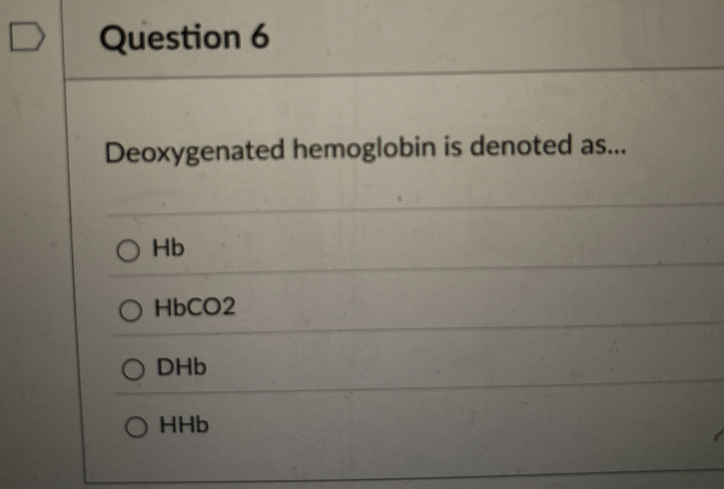 (Solved): Question 6 Deoxygenated hemoglobin is denoted as... Hb HbCO 2 DHb HHb ...