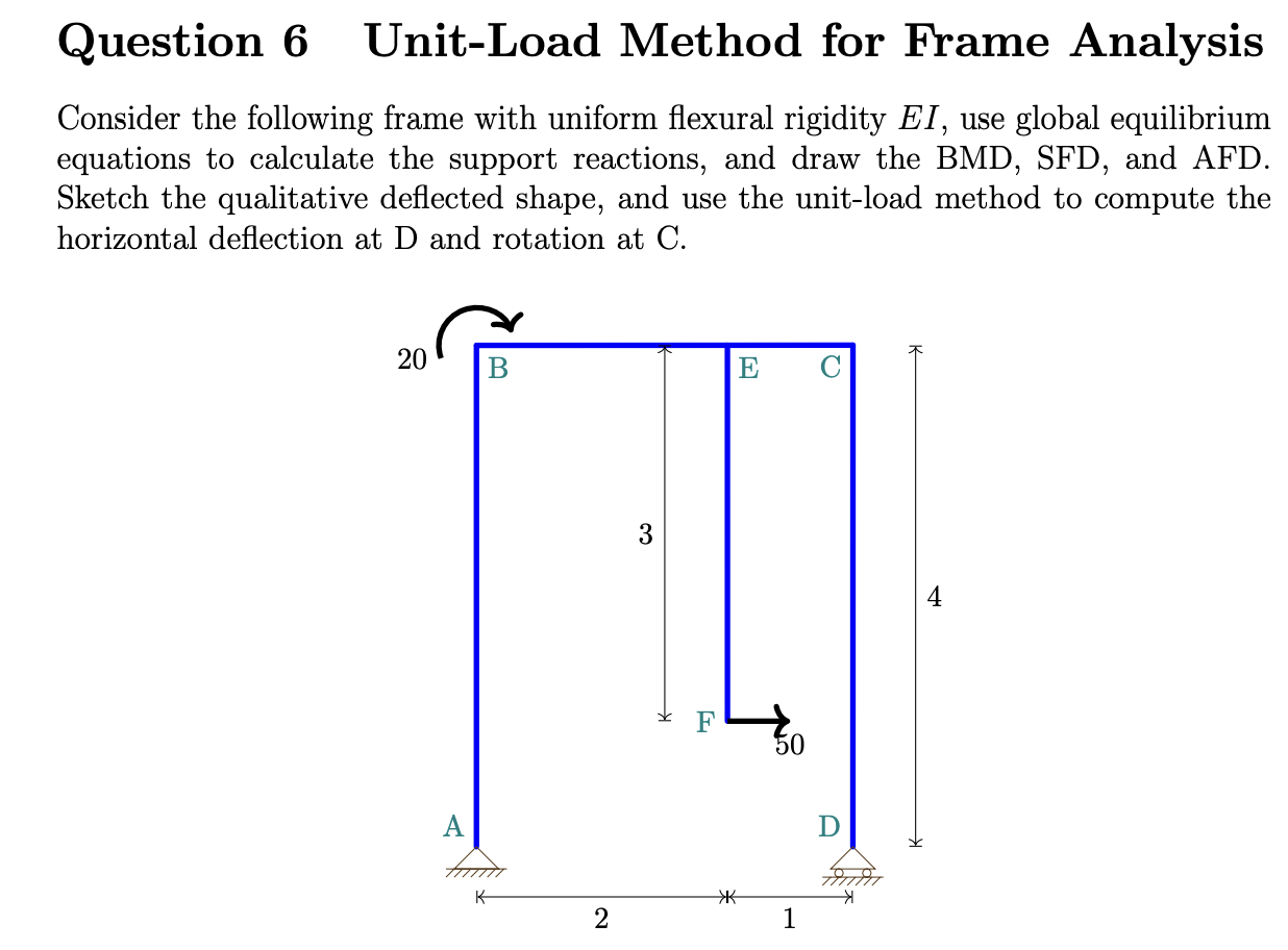 Question 6 Unit-Load Method for Frame Analysis Consider the following frame with uniform flexural rigidity \( E I \), use global equilibrium equations to calculate the support reactions, and draw the \( \mathrm{BMD}, \mathrm{SFD} \), and AFD . Sketch the qualitative deflected shape, and use the unit-load method to compute the horizontal deflection at D and rotation at C.