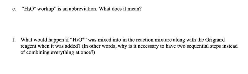 H_(3)O^(+)workup" is an abbreviation. What does it mean? reagent when it was added? (In other words, why is it necessary to have two sequential steps instead of combining everything at once?) a. Add curved arrows to the mechanism for the following reaction.