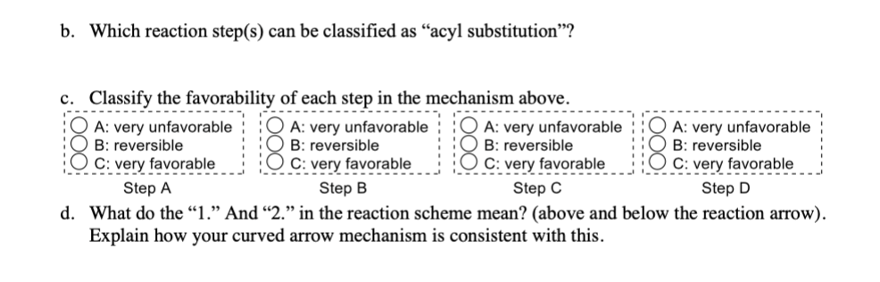 Reaction of a Grignard reagent with an ester: b. Which reaction step(s) can be classified as "acyl substitution"? c. Classify the favorability of each step in the mechanism above. d. What do the "1." And "2." in the reaction scheme mean? (above and below the reaction arrow). Explain how your curved arrow mechanism is consistent with this. e. "