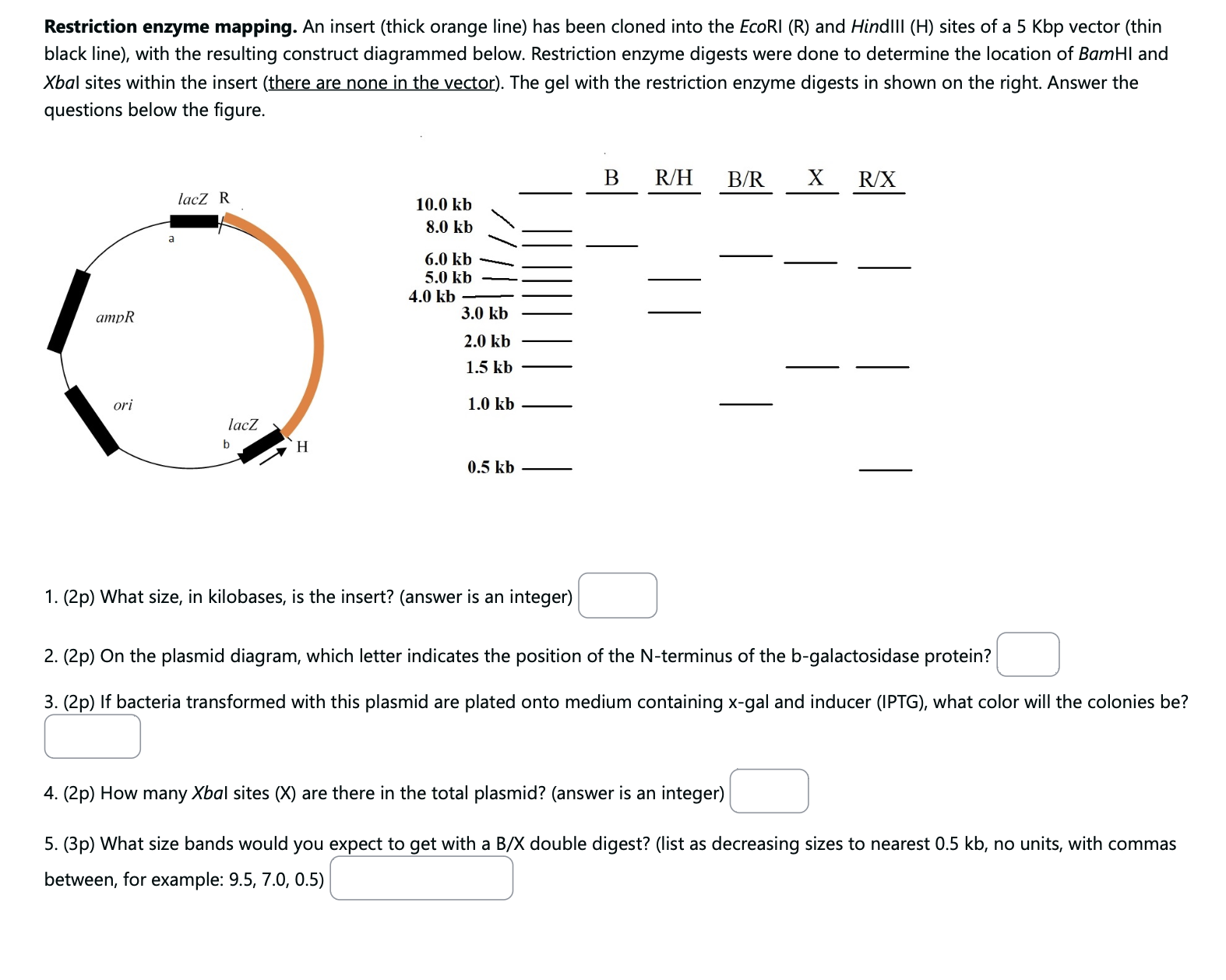 Restriction enzyme mapping. An insert (thick orange line) has been cloned into the EcoRI (R) and HindIII (H) sites of a 5 Kbp vector (thin black line), with the resulting construct diagrammed below. Restriction enzyme digests were done to determine the location of Bam HI and Xbal sites within the insert (there are none in the vector). The gel with the restriction enzyme digests in shown on the right. Answer the questions below the figure. 1. (2p) What size, in kilobases, is the insert? (answer is an integer) 2. (2p) On the plasmid diagram, which letter indicates the position of the N -terminus of the b-galactosidase protein? 3. (2p) If bacteria transformed with this plasmid are plated onto medium containing \( x \)-gal and inducer (IPTG), what color will the colonies be? 4. (2p) How many Xbal sites (X) are there in the total plasmid? (answer is an integer) 5. (3p) What size bands would you expect to get with a B/X double digest? (list as decreasing sizes to nearest 0.5 kb , no units, with commas between, for example: \( 9.5,7.0,0.5) \)
