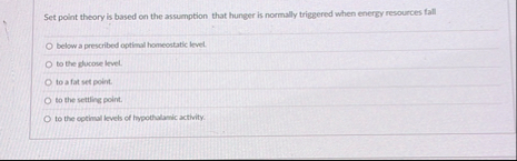Set point theory is based on the assumption that hunger is normally triggered when energy resources fall below a prescribed optimal homeostatic level. to the toomelevel. to a fat set point. to the setting polint. to the optimal levels of hypothalamic activity.
