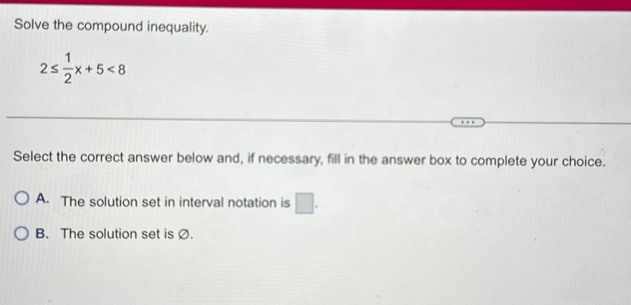 solve-the-compound-inequality-2-lt-1-2-x-5-lt-8-select-the-correct-answer-below-and-if-necessa-pa122