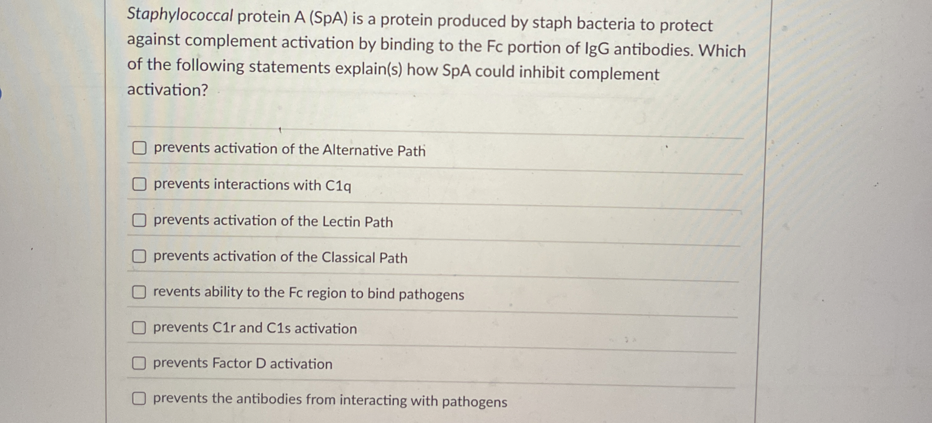 A(SpA)is a protein produced by staph bacteria to protect against complement activation by binding to the Fc portion of