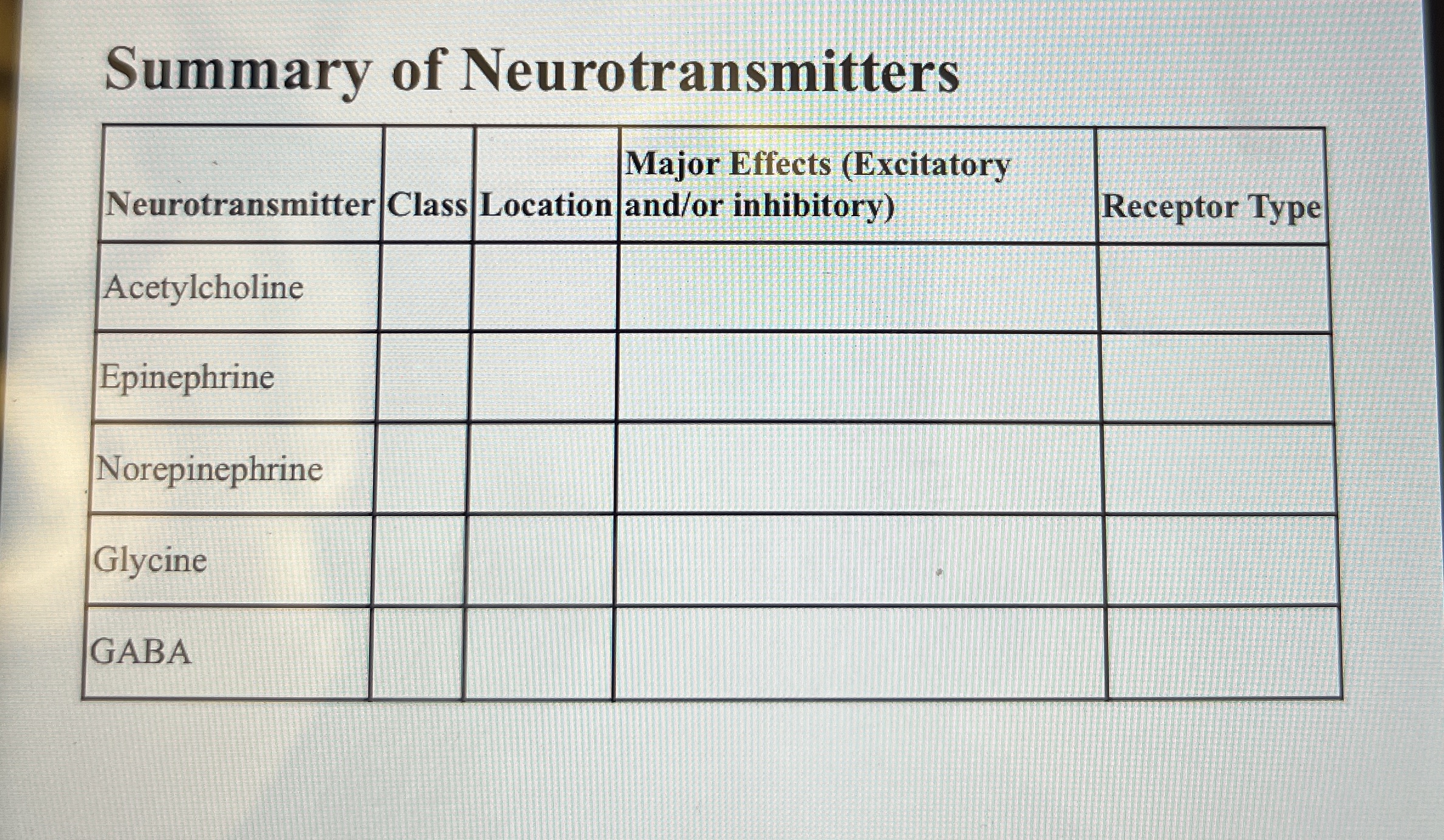 Summary of Neurotransmitters \table[[Neurotransmitter,Class,Location,\table[[Major Effects (Excitatory],[and/or inhibitory)]],Receptor Type],[Acetylcholine,,,,],[Epinephrine,,,,],[Norepinephrine,,,,],[Glycine,,,,],[GABA,,,,]]