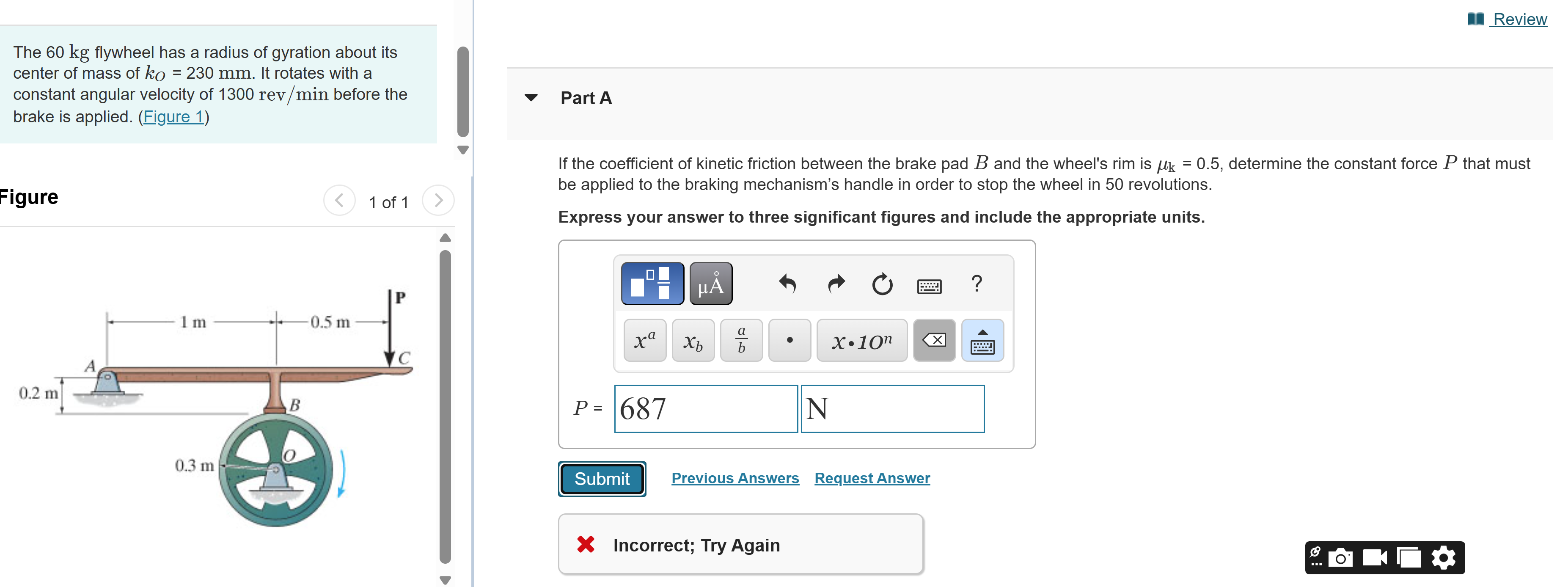 be applied to the braking mechanism's handle in order to stop the wheel in 50 revolutions.