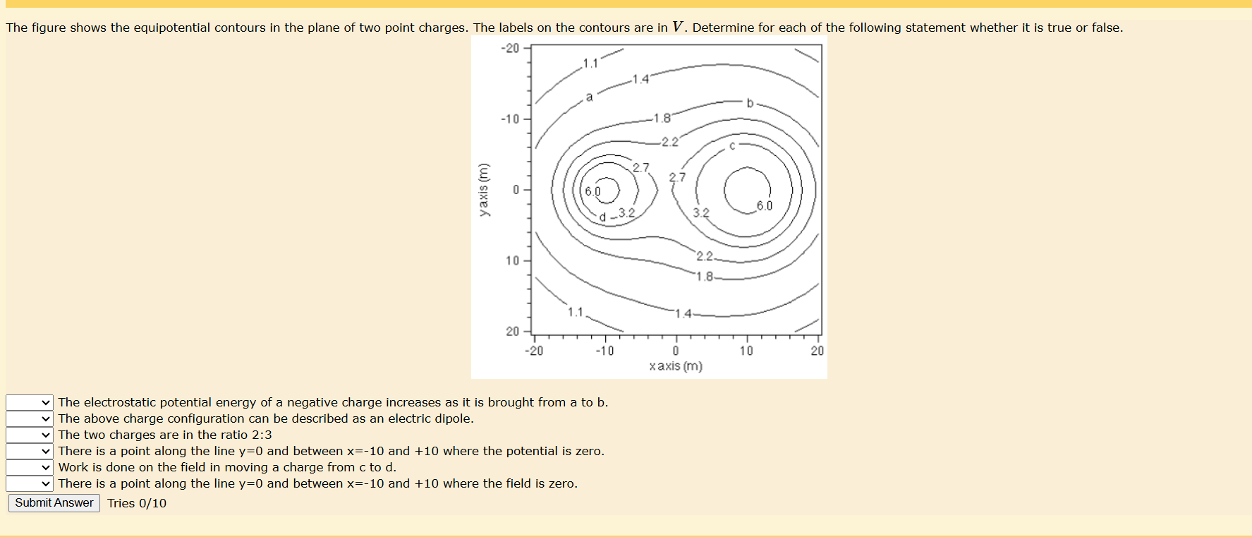 The electrostatic potential energy of a negative charge increases as it is brought from \( a \) to \( b \). The above charge configuration can be described as an electric dipole. The two charges are in the ratio 2:3 There is a point along the line \( y=0 \) and between \( x=-10 \) and +10 where the potential is zero. Work is done on the field in moving a charge from c to d. There is a point along the line \( y=0 \) and between \( x=-10 \) and +10 where the field is zero. Submit Answer Tries 0/10