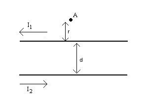 The figure below shows two long parallel, straight wires carrying currents, I1 = 3 A and I2 = 130 A. The distance between the wires is 18 m. What is the magnitude of the magnetic field (in nT) at point A , which is at a distance of 2 m from wire #1?