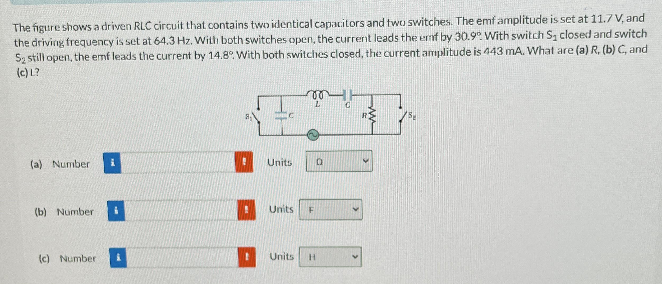 The figure shows a driven RLC circuit that contains two identical capacitors and two switches. The emf amplitude is set at 11.7 V , and the driving frequency is set at 64.3 Hz . With both switches open, the current leads the emf by