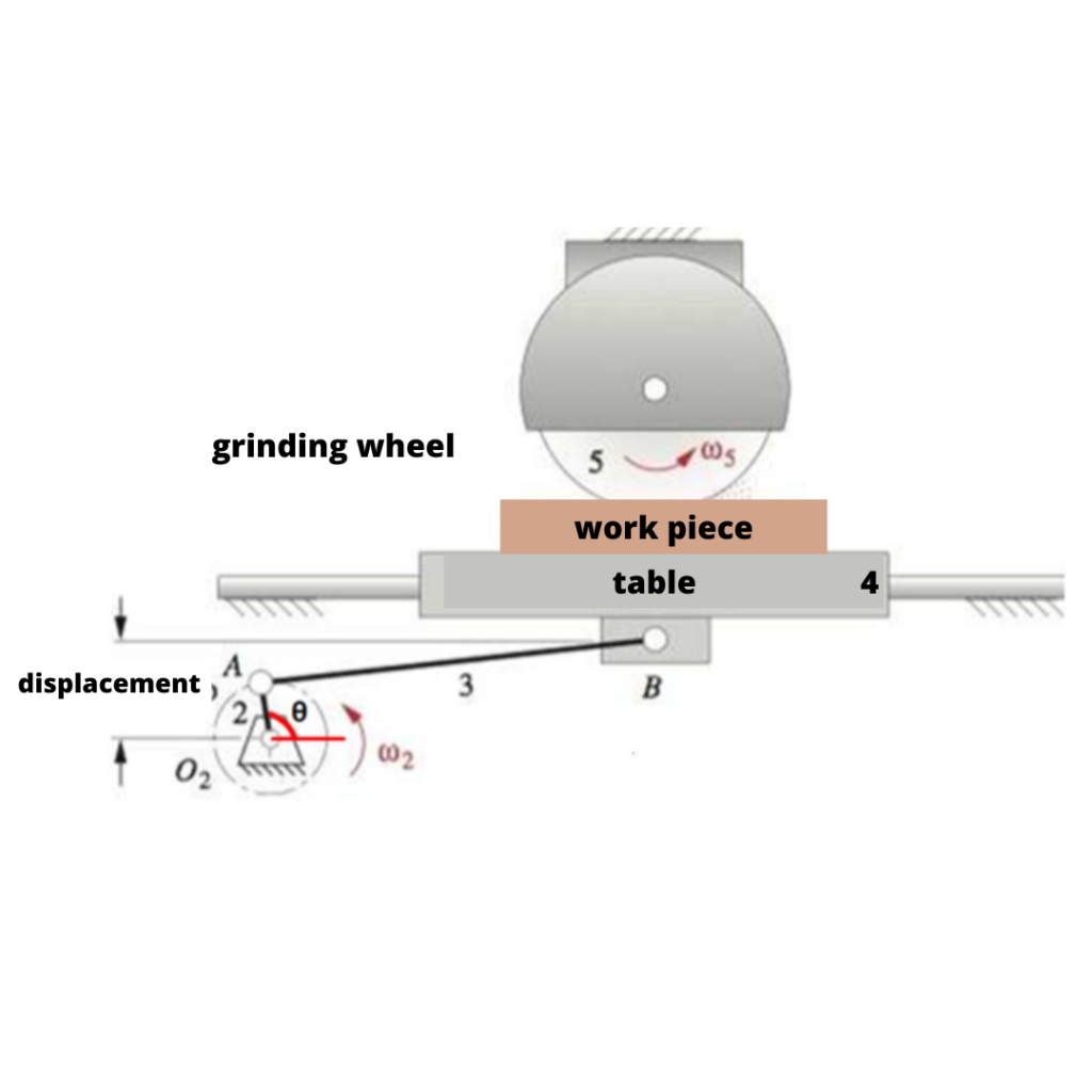 The figure shows a flat grinding machine. The workpiece oscillates below a 90 mm diameter grinding wheel rotating by a connecting rod mechanism crank, which has a 22mm crank, a 157mm connecting rod and 40mm offset. The crank rotates at 30 rpm, while the grinding wheel rotates at 3450 rpm. Calculate the relative acceleration of the grinding wheel's contact point with the workpiece when ? = 205°.