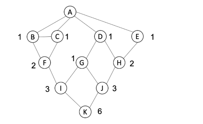 The following graph is the result of the forward step starting from node A when we calculate edge betweenness. Node values denote the number of shortest paths starting from node A.