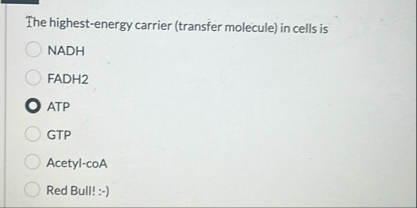 The highest-energy carrier (transfer molecule) in cells is NADH FADH2 ATP GTP Acetyl-coA Red Bull! ????