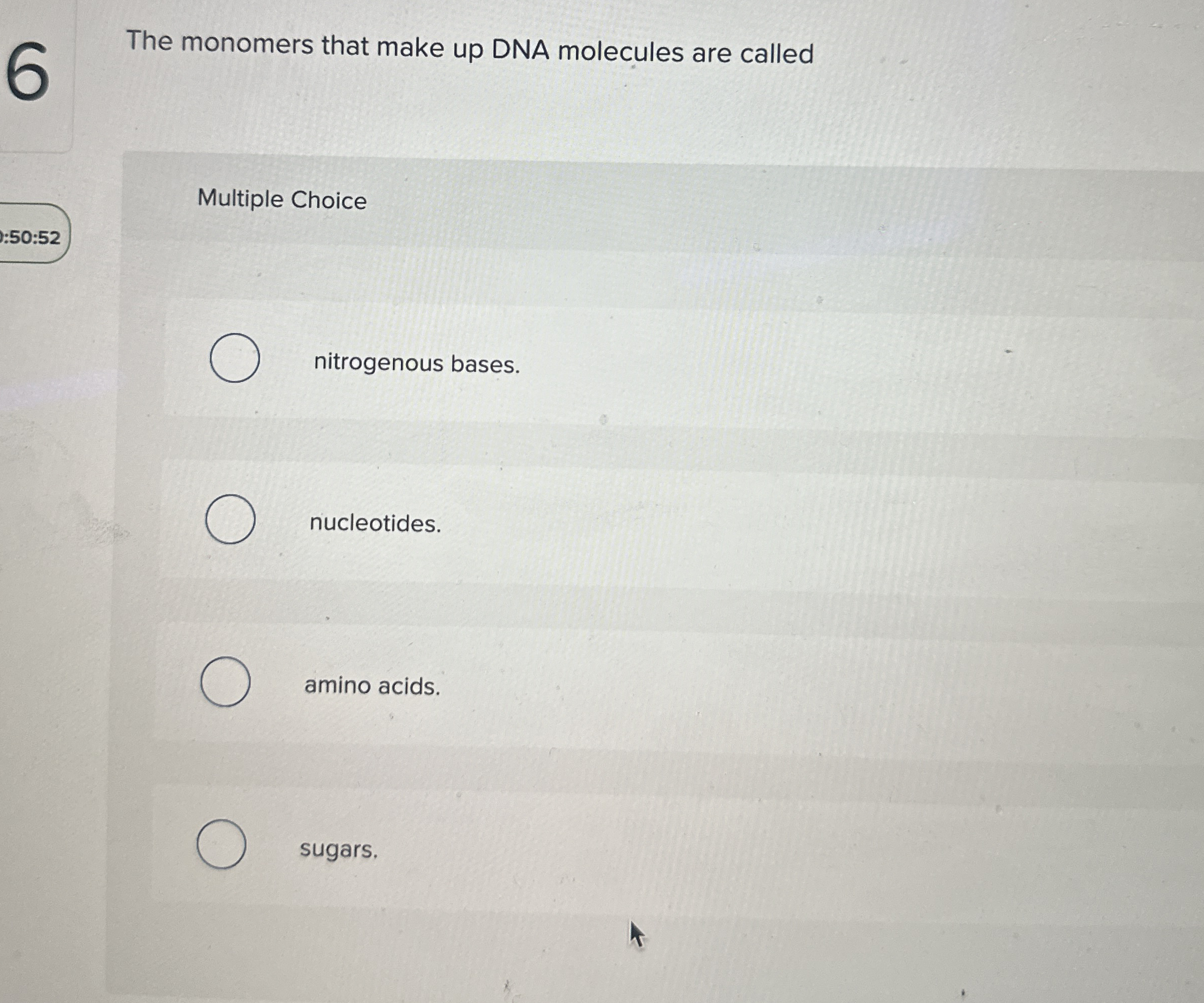nitrogenous bases. nucleotides. amino acids. sugars.