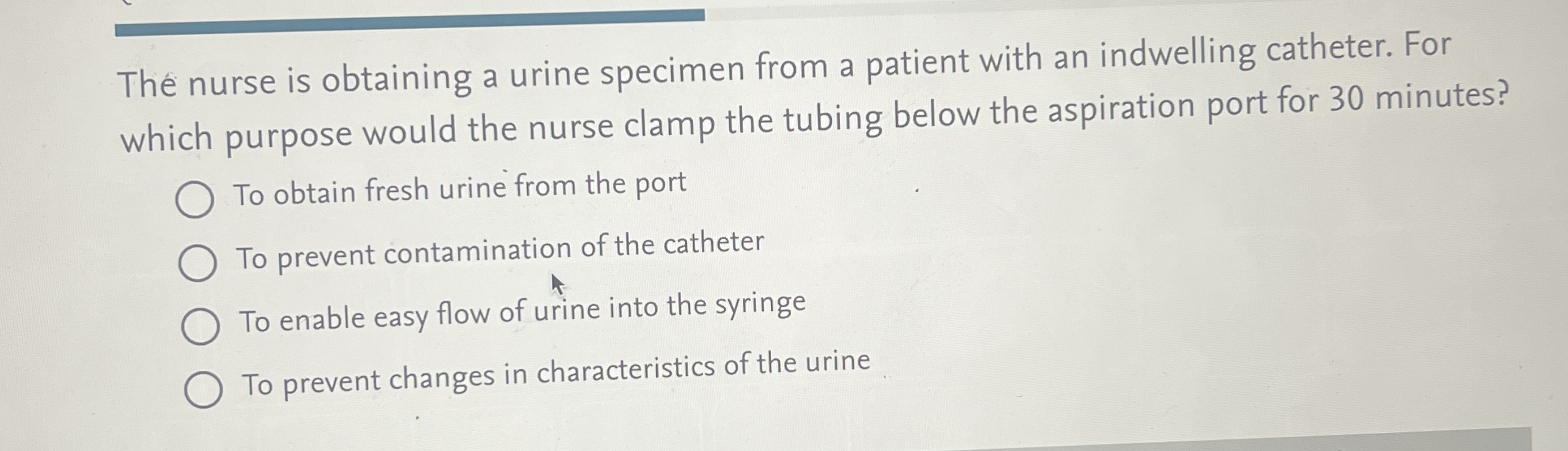 The nurse is obtaining a urine specimen from a patient with an indwelling catheter. For which purpose would the nurse clamp the tubing below the aspiration port for 30 minutes? To obtain fresh urine from the port To prevent contamination of the catheter To enable easy flow of urine into the syringe To prevent changes in characteristics of the urine