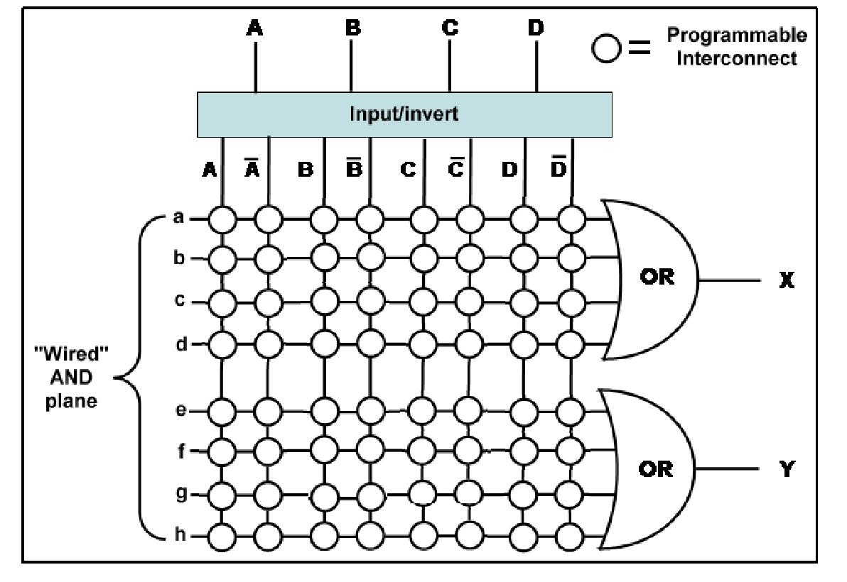 The PAL is a general-purpose programmable device to implement a SOP logical equation ❑ The circles in the figure represent fuses to program the device • The horizontal wires are the AND gates. ❑ The circuit would enable us to create two independent logical equations each containing 4-input AND terms ❑ Newer devices are reprogrammable by replacing fuse technology with FLASH technology