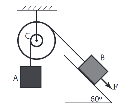 b) v_A , v_B , and angular velocity of the pulley at t = 2s when the system starts from rest. F = 5kN