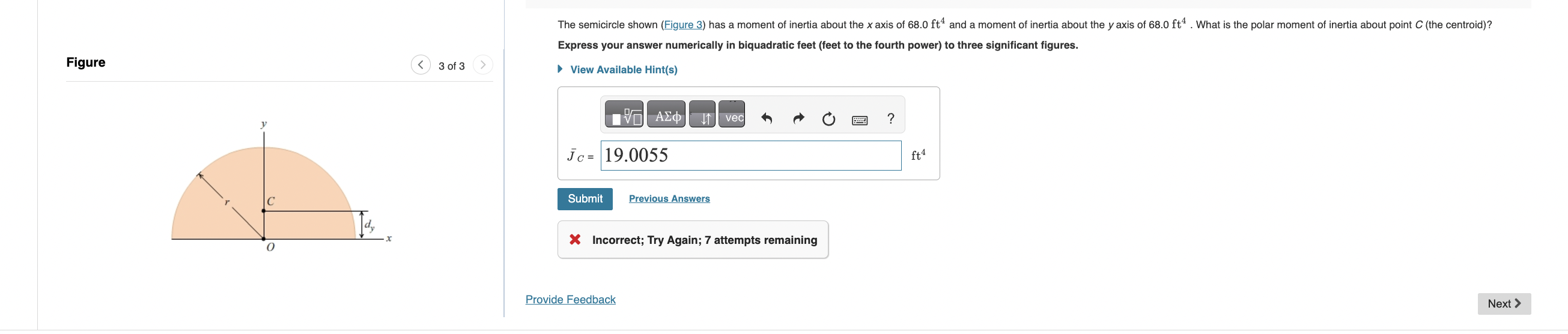 The semicircle shown (Figure 3) has a moment of inertia about the x axis of 68.0ft^(4) and a moment of inertia about the y axis of 68.0ft^(4). What is the polar moment of inertia about point C (the centroid)?