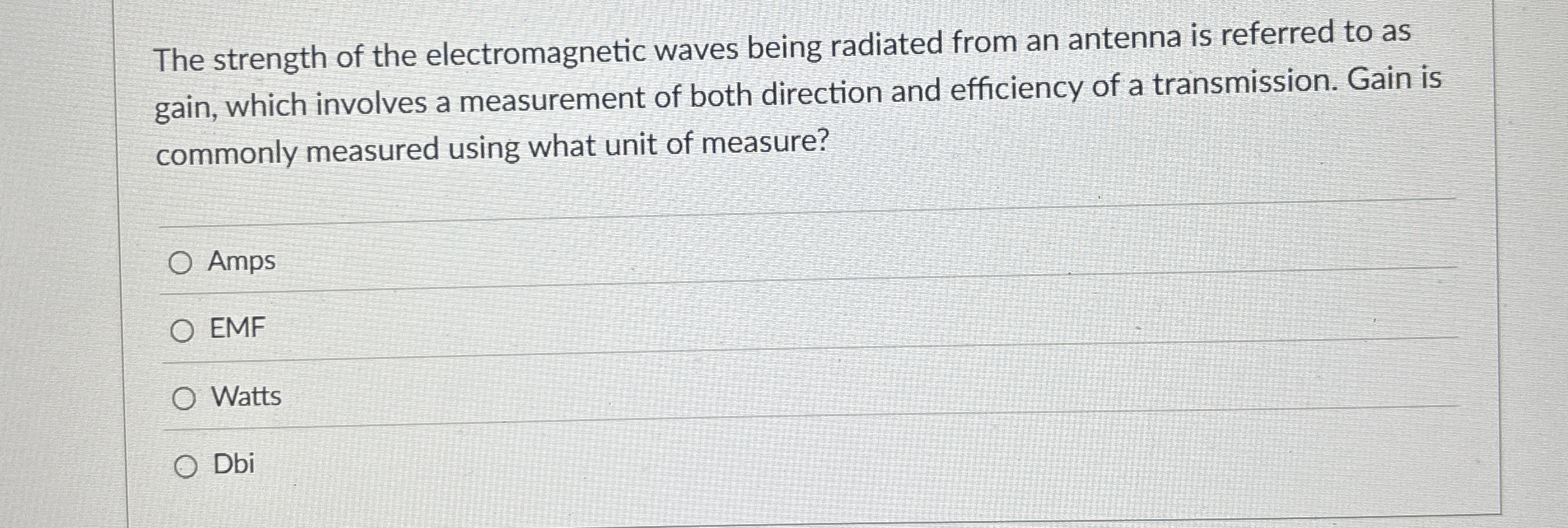The strength of the electromagnetic waves being radiated from an antenna is referred to as gain, which involves a measurement of both direction and efficiency of a transmission. Gain is commonly measured using what unit of measure? Amps EMF Watts Dbi