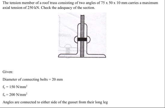 75\times 50\times 10mmcarries a maximum axial tension of 250 kN . Check the adequacy of the section. Given: Diameter of connecting bolts