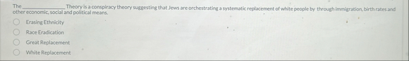 _(_())_(_())Theory is a conspiracy theory suggesting that Jews are orchestrating a systematic replacement of white people by through immigration, birth rates and other etonomic, sodial and political means.