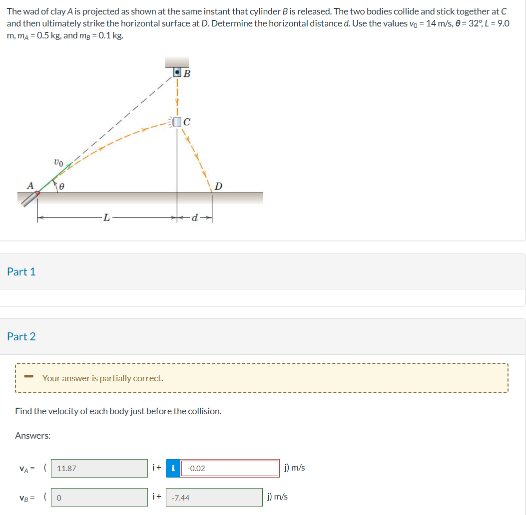 The wad of clay A is projected as shown at the same instant that cylinder B is released. The two bodies collide and stick together at C