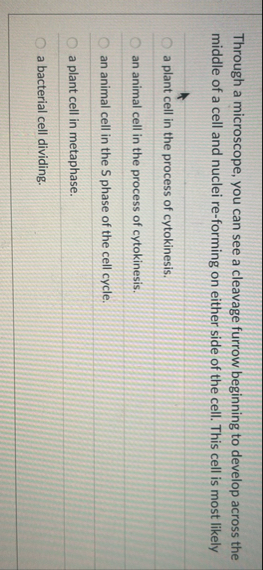 Through a microscope, you can see a cleavage furrow beginning to develop across the middle of a cell and nuclei re-forming on either side of the cell. This cell is most likely a plant cell in the process of cytokinesis. an animal cell in the process of cytokinesis. an animal cell in the S phase of the cell cycle. a plant cell in metaphase. a bacterial cell dividing.