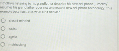 Timothy is listening to his grandfather describe his new cell phone. Timothy assumes his grandfather does not understand new cell phone technology. This example best illustrates what kind of bias?