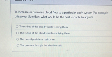 To increase or decrease blood flow to a particular body system (for example urinary or digestive), what would be the best variable to adjust? The radius of the blood vessels feeding them. The radius of the blood vessels emptying them. The overall peripheral resistance. The pressure through the blood vessels.