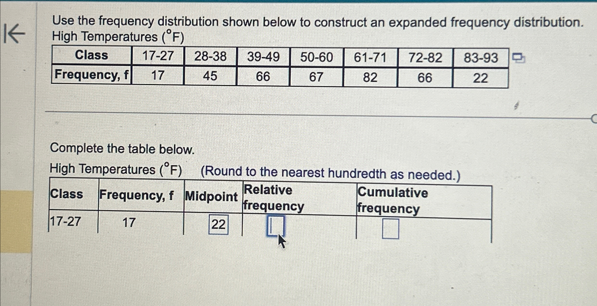 Use the frequency distribution shown below to construct an expanded frequency distribution. High Temperatures (