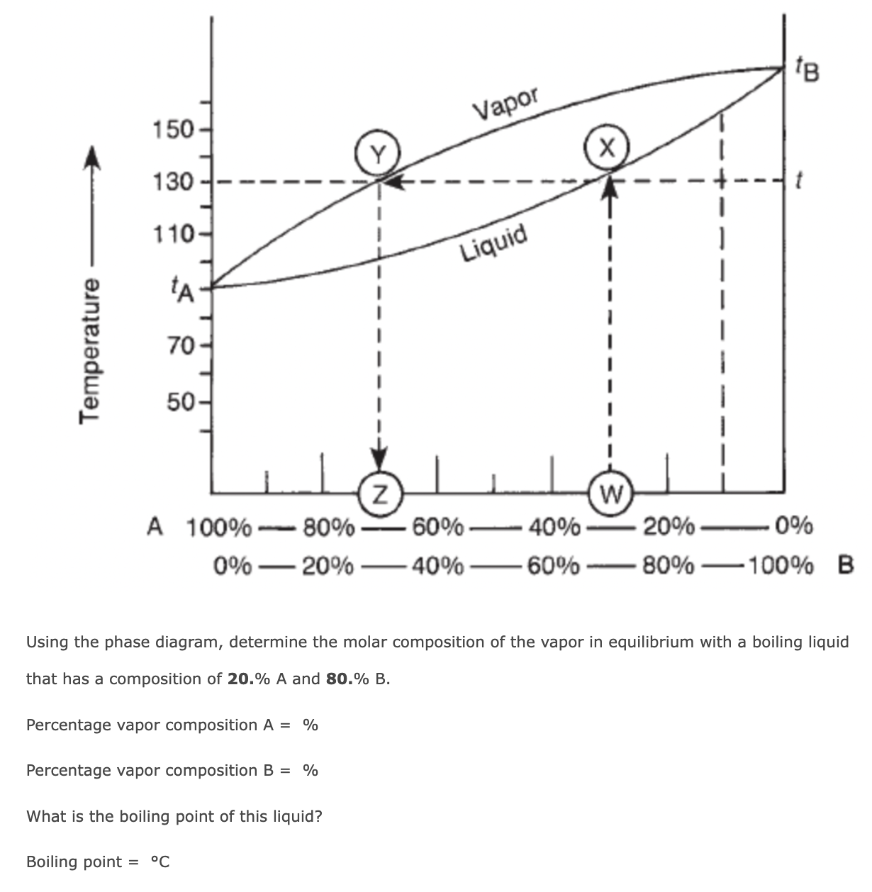 Using the phase diagram, determine the molar composition of the vapor in equilibrium with a boiling liquid that has a composition of