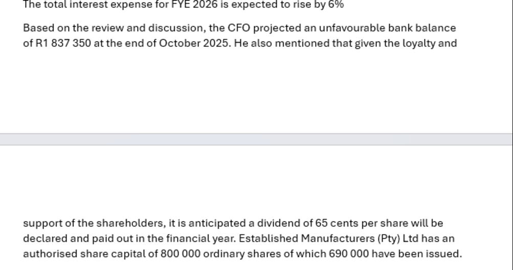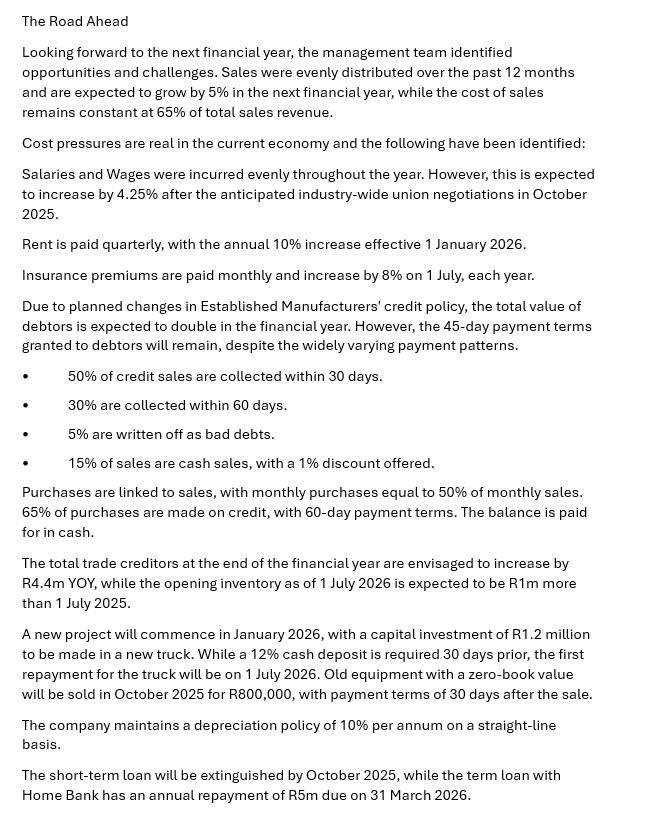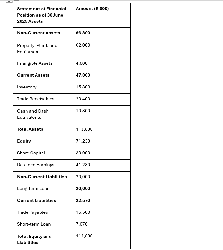 Using the Projected Statement of Comprehensive Income and Projected Statement of Financial Position prepared in Questions 2 and 3, respectively, along with any other relevant information from the case study, calculate the following financial ratios for 2026: 4.1 Current Ratio 4.2 Acid-Test Ratio 4.3 Net Profit Margin 4.4 Return on Assets 4.5 Return on Equity 4.6 Debt-to-Equity Ratio 4.7 Interest Coverage Ratio 4.8 Creditors Collection Period 4.9 Inventory turnover period 4.10 Earnings per share 4.11 Earnings retention ratio NB: Where applicable, answers must be rounded to two decimal places.