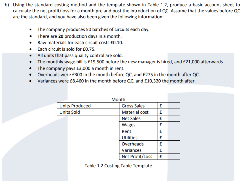 Using the standard costing method and the template shown in Table 1.2, produce a basic account sheet to calculate the net profit/loss for a month pre and post the introduction of QC. Assume that the values before QC are the standard, and you have also been given the following information: • The company produces 50 batches of circuits each day. • There are 20 production days in a month. • Raw materials for each circuit costs £0.10. • Each circuit is sold for £0.75. • All units that pass quality control are sold. • The monthly wage bill is £19,500 before the new manager is hired, and £21,000 afterwards. • The company pays £3,000 a month in rent. • Overheads were £300 in the month before QC, and £275 in the month after QC. • Variances were £8.460 in the month before QC, and £10,320 the month after. b) Using the standard costing method and the template shown in Table 1.2, produce a basic account sheet to calculate the net profit/loss for a month pre and post the introduction of QC. Assume that the values before QC are the standard, and you have also been given the following information: - The company produces 50 batches of circuits each day. - There are \( \mathbf{2 0} \) production days in a month. - Raw materials for each circuit costs \( £ 0.10 \). - Each circuit is sold for \( £ 0.75 \). - All units that pass quality control are sold. - The monthly wage bill is \( £ 19,500 \) before the new manager is hired, and \( £ 21,000 \) afterwards. - The company pays \( £ 3,000 \) a month in rent. - Overheads were \( £ 300 \) in the month before QC, and \( £ 275 \) in the month after QC. - Variances were \( £ 8.460 \) in the month before QC, and \( £ 10,320 \) the month after. Table 1.2 Costing Table Template