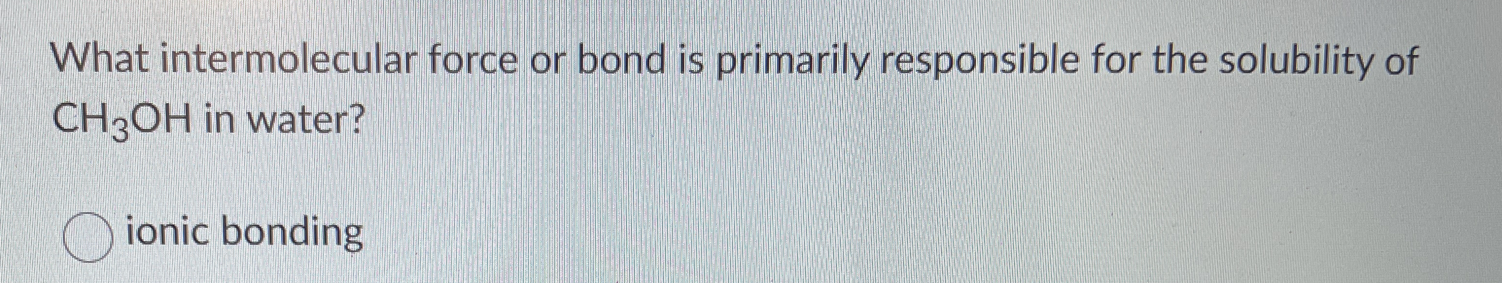 (Solved): What intermolecular force or bond is primarily responsible for the solubility of CH_(3)OH in water? ...