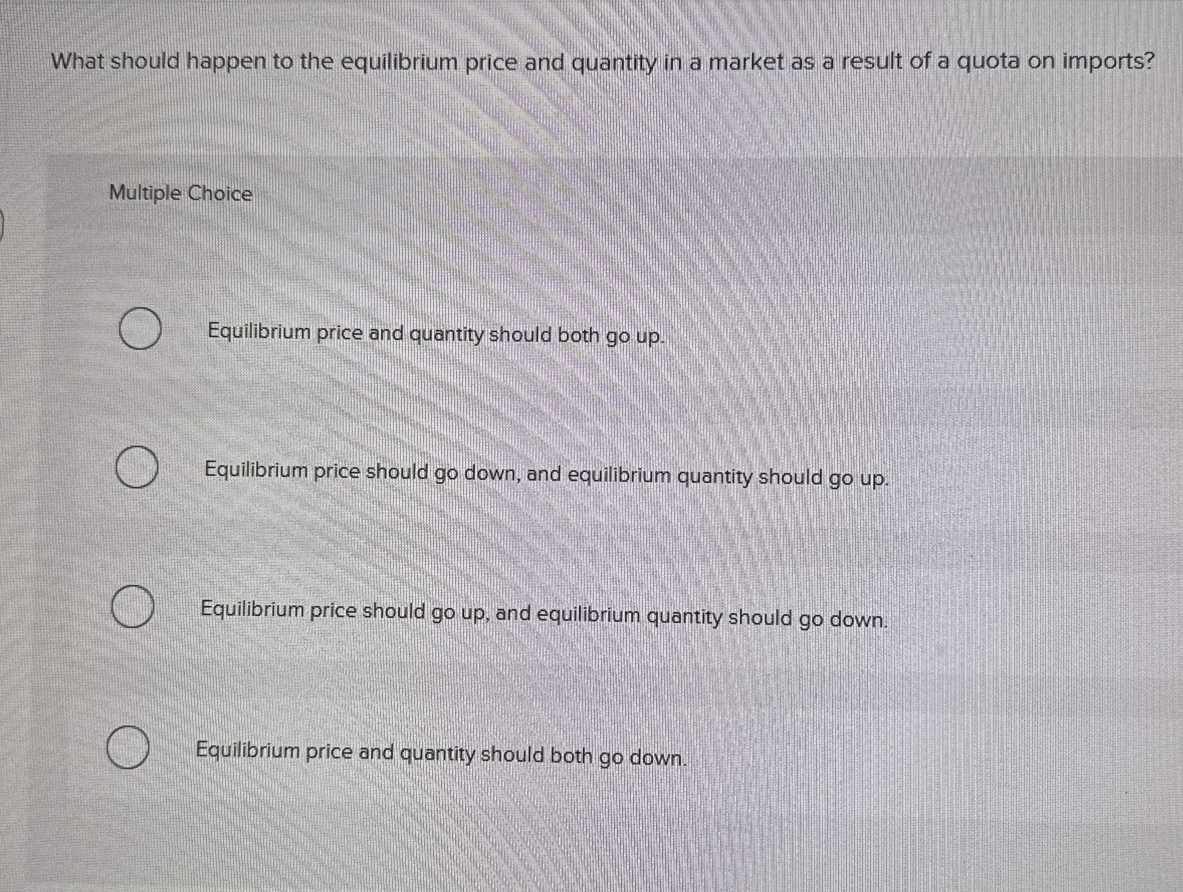What should happen to the equilibrium price and quantity in a market as a result of a quota on imports? Multiple Choice Equilibrium price and quantity should both go up. Equilibrium price should go down, and equilibrium quantity should go up. Equilibrium price should go up, and equilibrium quantity should go down. Equilibrium price and quantity should both go down.