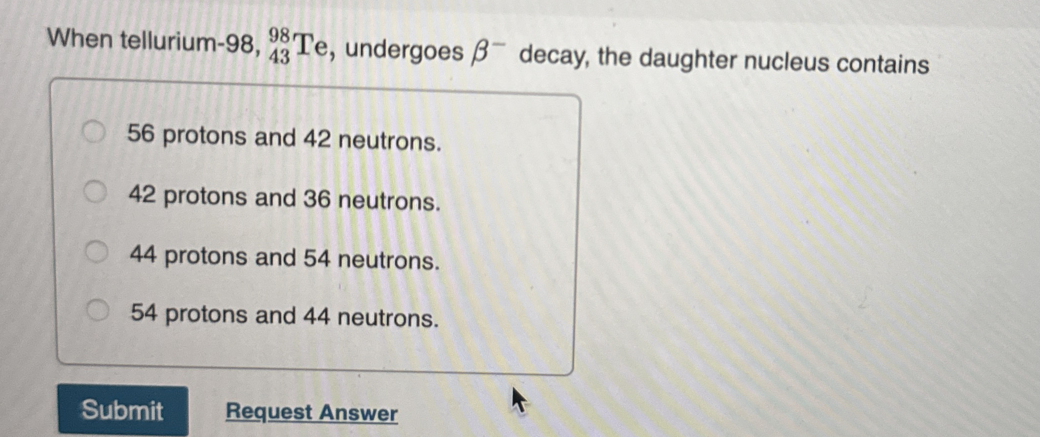 decay, the daughter nucleus contains 56 protons and 42 neutrons. 42 protons and 36 neutrons. 44 protons and 54 neutrons. 54 protons and 44 neutrons. Request Answer
