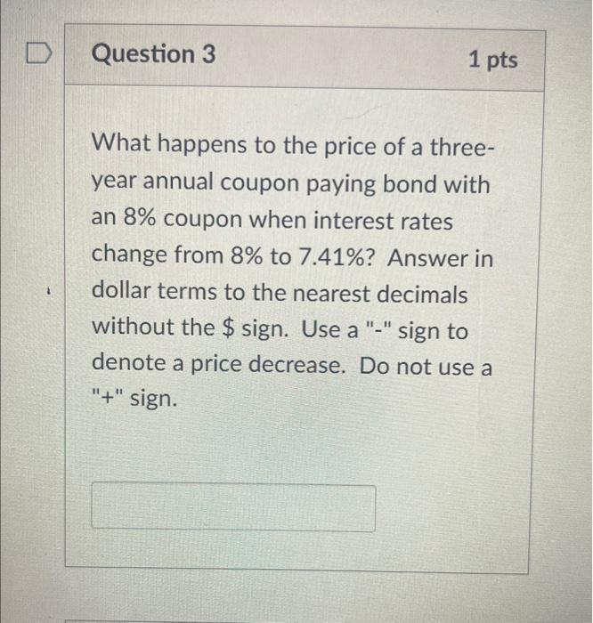 What happens to the price of a threeyear annual coupon paying bond with an 8% coupon when interest rates change from 8% to 7.41% ? Answer in dollar terms to the nearest decimals without the \$ sign. Use a "-" sign to denote a price decrease. Do not use a "+" sign.