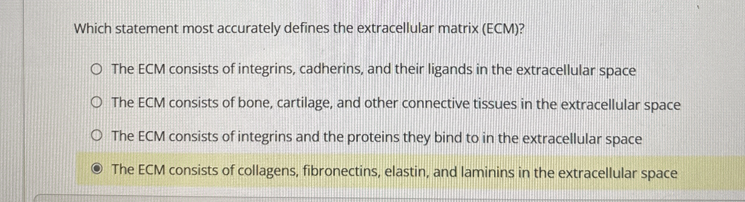 Which statement most accurately defines the extracellular matrix (ECM)? The ECM consists of integrins, cadherins, and their ligands in the extracellular space The ECM consists of bone, cartilage, and other connective tissues in the extracellular space The ECM consists of integrins and the proteins they bind to in the extracellular space The ECM consists of collagens, fibronectins, elastin, and laminins in the extracellular space