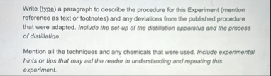 Write (type) a paragraph to describe the procedure for this Experiment (mention reference as text or footnotes) and any deviations from the published procedure that were adapted. Include the set-up of the distillation apparatus and the process of distillation. Mention all the techniques and any chemicals that were used. Include experimental hints or tips that may aid the reader in understanding and repeating this experiment.